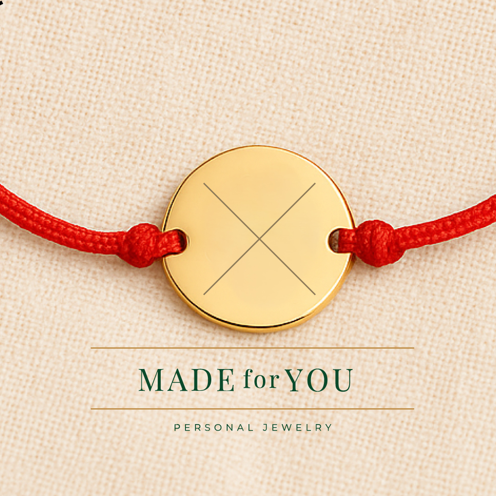 💛✨ Златна гривна с конец – Гравирани инициали е елегантен персонален талисман. Основният модел е от 14K жълто злато с кръгъл медальон Ø 15 мм и регулируем мек конец. По желание изработваме и в 14K бяло злато или Сребро 925.