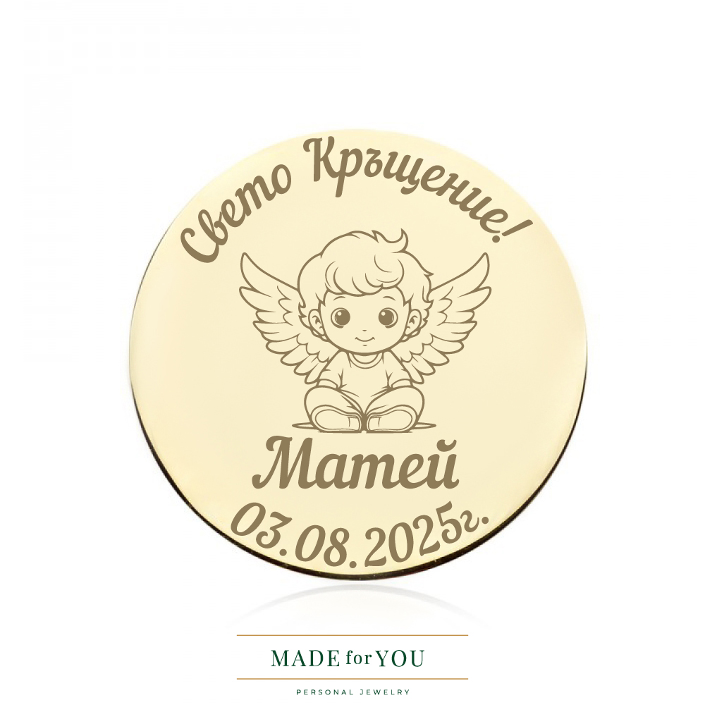 👼💙 Нашата Златна монета – Бебе ангел момче е символ на чистота, невинност и небесна закрила. Тя е идеален и персонален подарък за кръщене, за появата на новородено или за първи рожден ден. Монетата съчетава стойността на благородните метали и духовното послание, превръщайки се във вечен семеен спомен.
